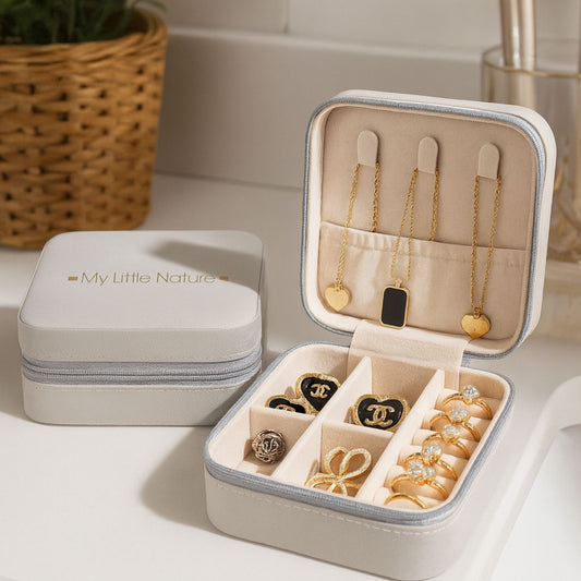 My Little Nature's elegant travel jewelry box, where style meets practicality. Perfectly sized for travel or everyday use, these sleek, compact boxes are adorned with the My Little Nature logo.
