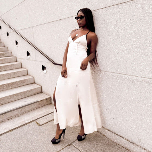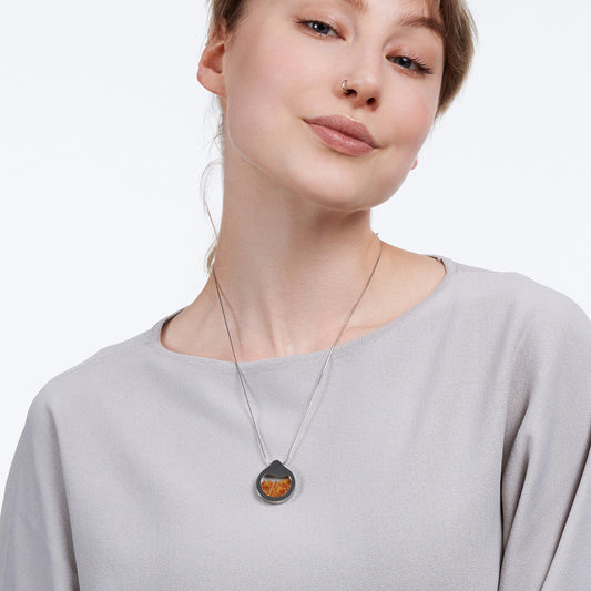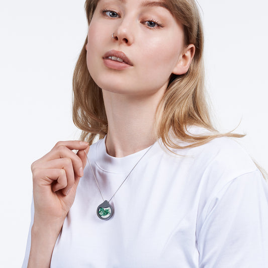 Erweitern Sie Ihre Schmucksammlung mit dieser wunderschönen handgefertigten Halskette. Dieser tropfenförmige Anhänger wurde von Barbora Adamonytė-Keidūnė entworfen und von Aura Jakstė fachmännisch gefertigt. Er ist in polierten Edelstahl eingefasst und verleiht ihm eine elegante, moderne Note.