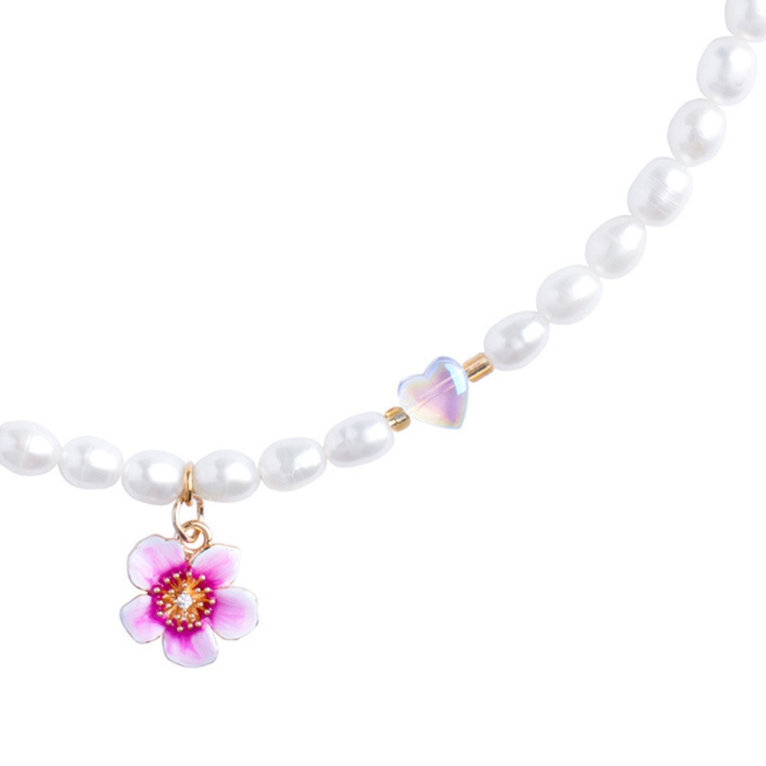 Material: Genuine freshwater pearls, gold - plated stainless steel charms, glass hearts, K9 Glass Diamond Effect Crystal.