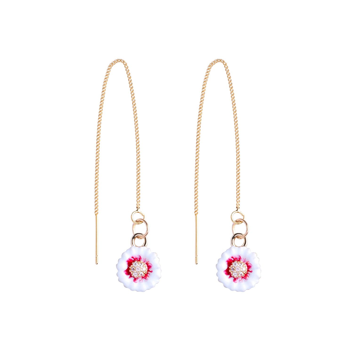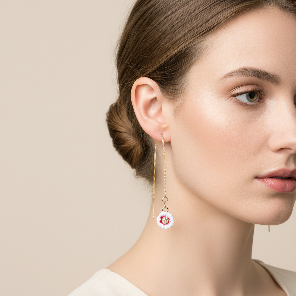Dailiai krintanti grandinėlė suteikia auskarams modernios elegancijos, o ramunėlės akcentas tampa švelniu įvaizdžio papuošimu, puikiai derančiu tiek su kasdiene apranga, tiek su šventiniu įvaizdžiu.