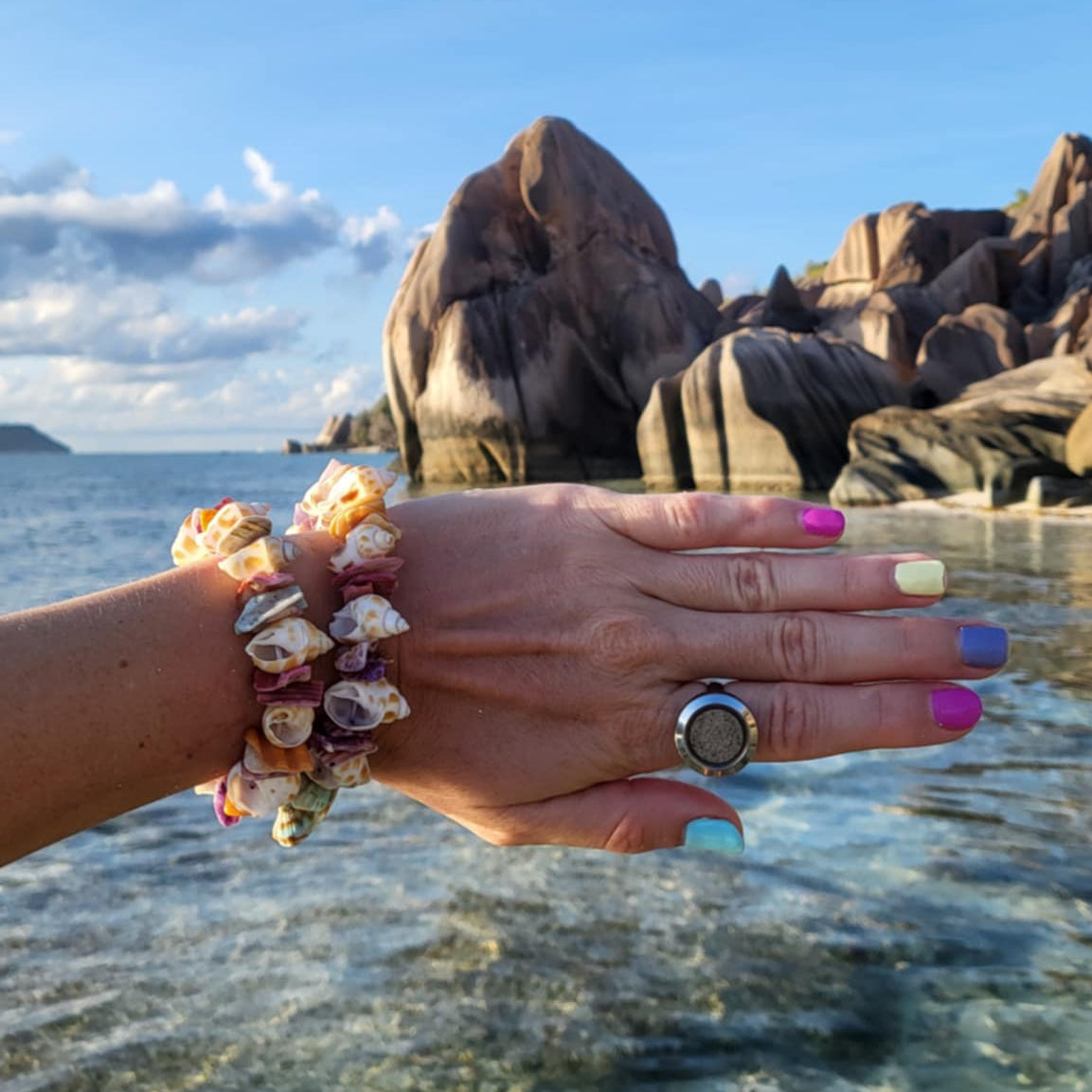 Pasinerkite į pakrantės ramybę su mūsų rankų darbo žiedu, pagamintu iš natūralaus Baltijos jūros smėlio, saugomo po stikliuku. Šis unikalus dizainas perteikia raminančią pakrantės esmę, o smėlio smiltelės simbolizuoja laiko tėkmę ir grožį, slypintį trumpalaikėse akimirkose. Žiedas yra nešiojamas priminimas branginti dabartį ir mėgautis paprastų gyvenimo malonumų ramybe. Puikiai tinka pajūrio mylėtojams ir tiems, kurie ieško ryšio su gamtos grožiu.