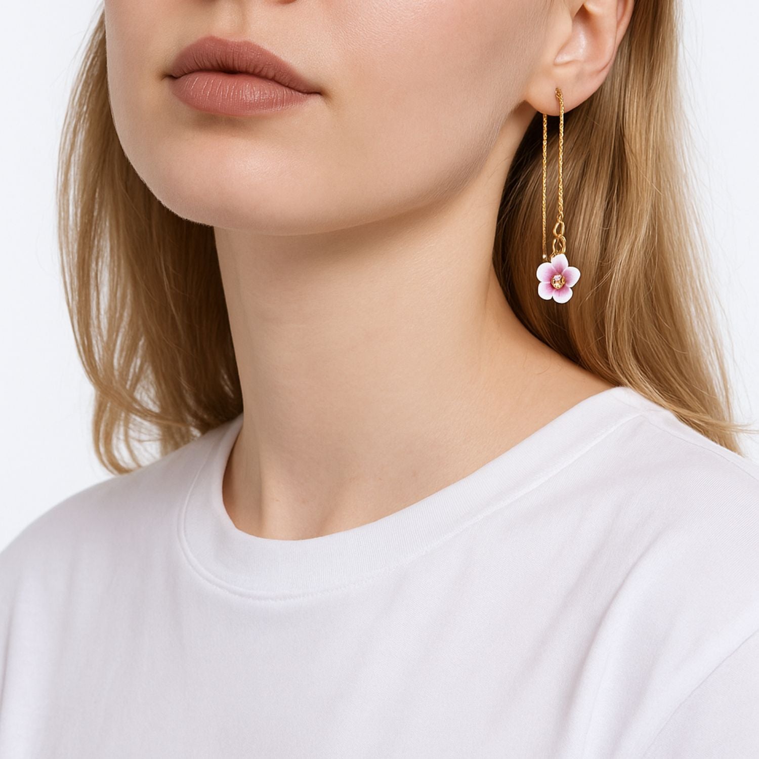Pagaminti iš nerūdijančio plieno ir padengti auksu, auskarai yra hipoalerginiai, ilgaamžiai ir dailiai krintantys. Perveriamas „threader“ dizainas suteikia modernios elegancijos ir subtilaus judesio, o plumerijos žiedelis tampa išskirtiniu akcentu, puikiai tinkančiu tiek kasdienai, tiek šventei.